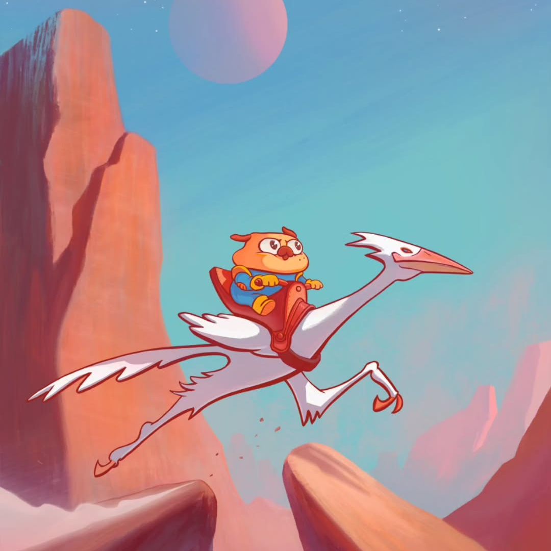 valtava lintu nimeltä Rodeo, Panin uskollinen ratsu, polvistuu sulavasti, auttaen pientä Leipäkoiraa kiipeämään selkäänsä.